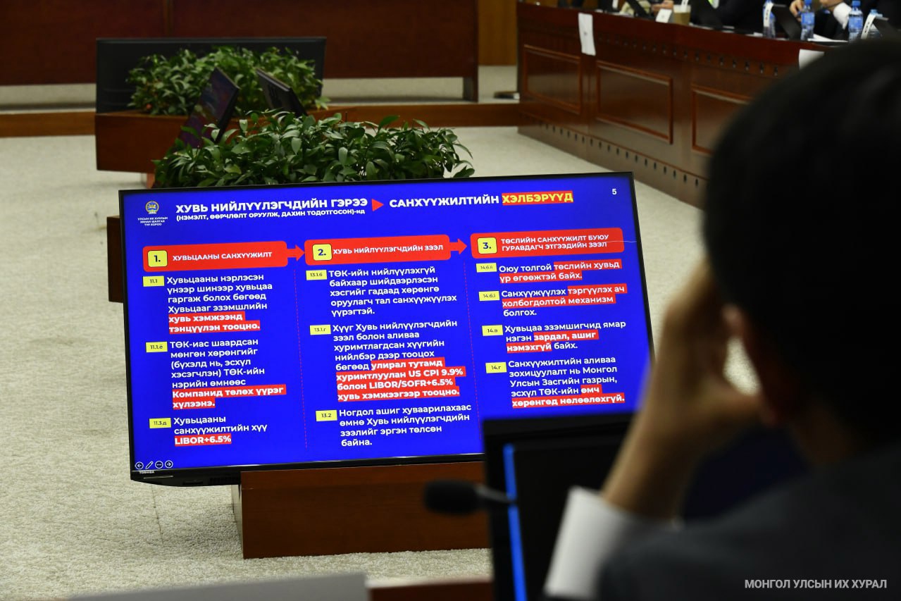 2025 оны 12 дугаар сарын 08-ны өдрийн сонсголоор “Жавхлант” (MV-15225), “Шивээ толгой” (MV-15226) ашиглалтын тусгай зөвшөөрлийн талбайн нөөцийг тогтоож, үнэлгээг тодорхойлсон болон холбогдох бусад баримтад үндэслэн төрийн эзэмшлийн хувь, хэмжээг тогтоохтой холбоотой асуудлаар нотлох баримтуудыг шинжлэн судалсан бол 10-ны өдөр “Оюу толгой” ХХК-ийн Хувь нийлүүлэгчдийн гэрээ /Нэмэлт, өөрчлөлт оруулж, дахин тодотгосон/-ний санхүүжилтийн хүүгийн хувь, түүнийг олон улсын зах зээлийн жишигт нийцүүлэн бууруулах талаар авч хэрэгжүүлсэн арга хэмжээ, холбогдох үр дагаварын асуудлаар нотлох баримтуудыг шинжлэн судалсан юм хэмээн Улсын Их Хурлын Хэвлэл мэдээллийн газраас мэдээллээ.