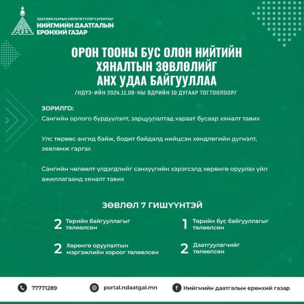 НИЙГМИЙН ДААТГАЛЫН ҮНДЭСНИЙ ЗӨВЛӨЛИЙН 2024 ОНЫ 11 ДҮГЭЭР САРЫН 08-НЫ ӨДРИЙН ТОГТООЛООР ХАРААТ БУС АЖИЛЛАХ МЭРГЭЖЛИЙН ХОРОО, ОРОН ТООНЫ БУС ОЛОН НИЙТИЙН ХЯНАЛТЫН ЗӨВЛӨЛИЙГ АНХ УДАА БАЙГУУЛЛАА
